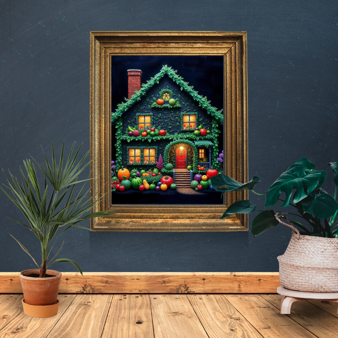 Enhance your digital collection with this whimsical and charming "Fruit-house BioArt Wall Frame" NFT! This enchanting digital artwork masterfully blends nature and artistry, featuring a detailed house covered in lush green vines and adorned with vibrant fruits and vegetables. The cozy dwelling, with its warm glowing windows and inviting red door, is surrounded by an abundant garden of pumpkins, tomatoes, watermelons, and other colorful produce.